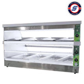 - زیر طبقه پایینی این گرمکن شیشه ای مرغ سوخاری 2 عدد حوضچه وجود دارد تا با ریختن آب در هر حوضچه طبقه پایین گرم کردن این طبقه به صورت مرطوب انجام شود اما طبقه بالایی این گرمخانه شیشه ای به صورت خشک برای نگهداری دیگر مواد غذایی می باشد.
