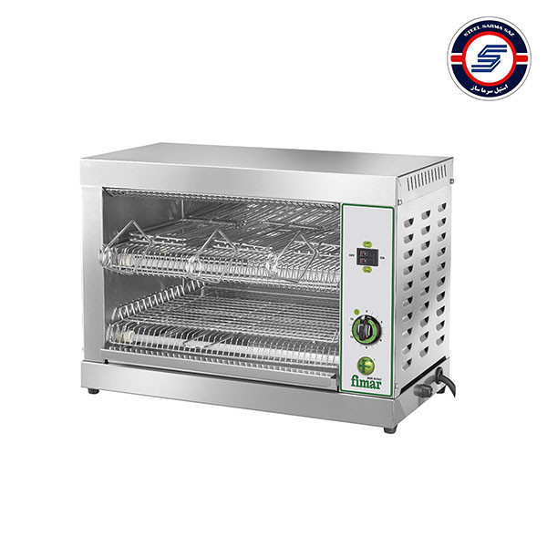 توستر نان رومیزی فیمار مدل TOP-3D محصولی از کشور ایتالیا بوده که شرکت پرآوازهاش یعنی Fimar آن را طراحی، تولید و به بازارهای بینالمللی عرضه کرده است. به این محصول، آون توستر رومیزی هم میگویند. همچنین با توجه به اینکه بخش بسزایی از قیمت توستر رومیزی فیمار صرف استفاده از آلیاژ استنلس استیل برای پوشش آن شده، میتوان از عنوان آون توستر تمام استیل نیز برای خطاب قرار دادنش استفاده کرد. توان مصرفی توستر نان فیمار 2.2 کیلووات بوده و برق بسزایی را نیاز دارد. ازاینرو باید آن را یک دستگاه توستر صنعتی بدانیم، چراکه ظرفیتش نیز چشم گیر بوده و با خرید توستر رومیزی فیمار میتوان در هر بار استفاده، 3 عدد تست را آماده کرد. این در حالی است که برق مصرفی این نوع دستگاه توستر نان برابر با 230 ولت است.